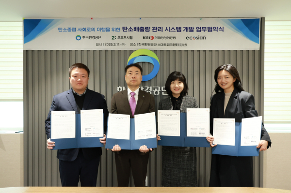 기후에너지환경부 산하 한국환경공단(이사장 임상준)은 11일 서울 당산동 한국환경공단 스마트워크센터에서 오후두시랩㈜, 한국경영인증원, ㈜에코시안과 ‘탄소중립 사회 이행을 위한 탄소배출량 관리 시스템 개발’ 업무협약(MOU)을 체결했다고 밝혔다.