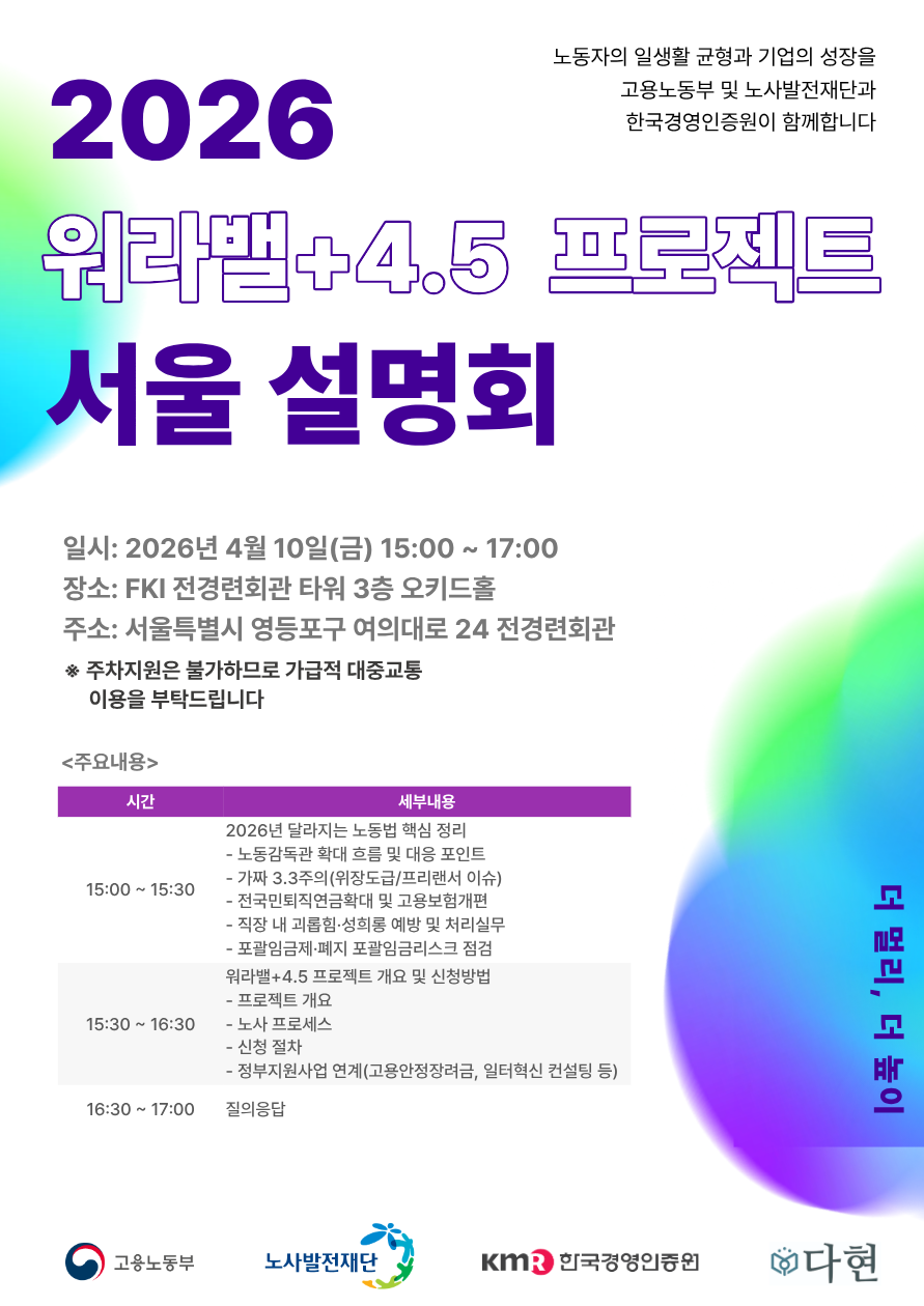 안녕하세요. 고용노동부와 노사발전재단과 함께 「2026년 워라밸+4.5 프로젝트」 운영하는 한국경영인증원입니다.