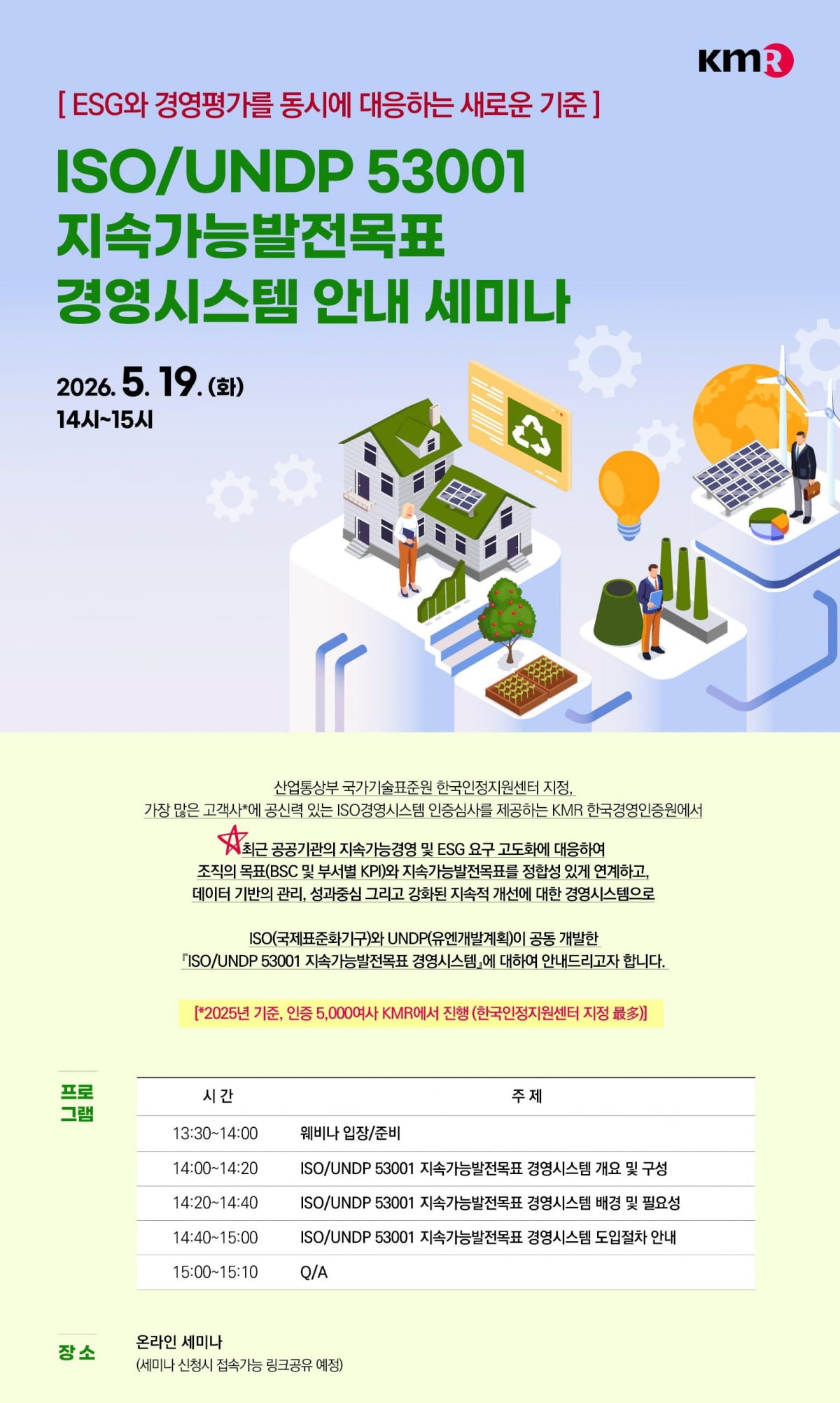 종합 지식서비스 기관 한국경영인증원(KMR)은 5월 9일 ISO/UNDP 53001 지속가능발전목표 경영시스템 안내 세미나를 진행한다.