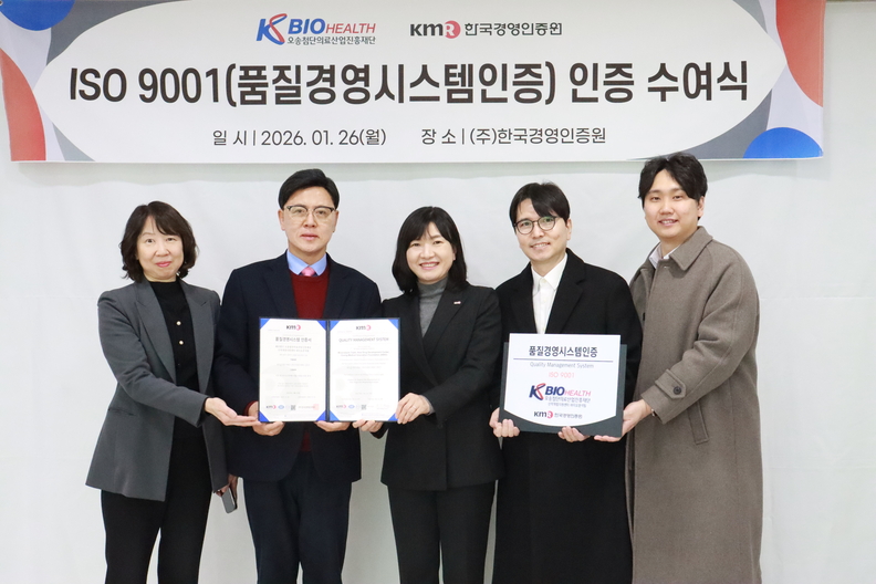 오송첨단의료산업진흥재단(KBIOHealth·이사장 이명수) 신약개발지원센터 바이오분석팀은 27일 국제 품질경영시스템 표준인 ISO 9001 인증을 획득했다고 밝혔다.