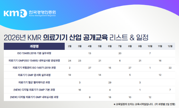 [교육] 한국경영인증원, 2026년 의료기기 교육 확대 운영... 디지털 의료기기 GMP 포함 연간 일정 공개