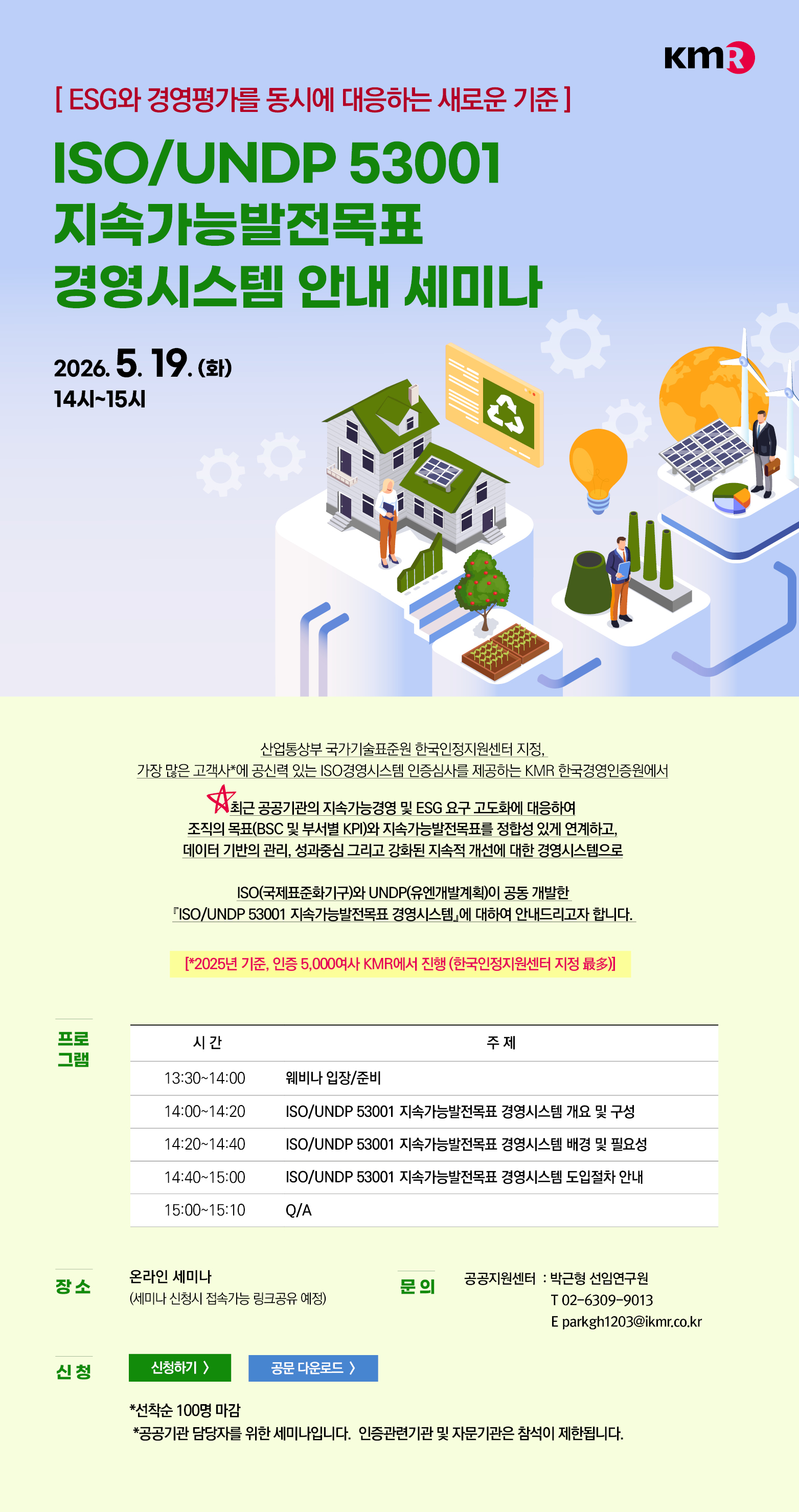 [온라인/진행중] ISO/UNDP 53001 지속가능발전목표 경영시스템 세미나 안내 (5/19, 화)