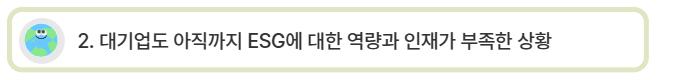 둘째, 대기업도 아직까지 ESG에 대한 역량과 인재가 부족한 상황입니다.